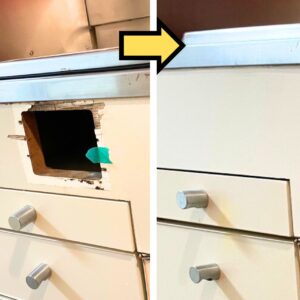 キッチン欠損補修:開口内部に下地板を設置、パテ充填の上塗装